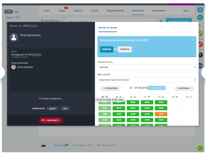 - Запись на прием сотрудником в «Битрикс24». Запись на прием во время звонка.