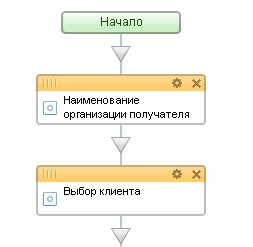 Далее вносим в ветку бизнес-процесса два действия "Запрос crm компании", переименовывая их для нашего удобства в "Наименование организации получателя" и "Выбор клиента":