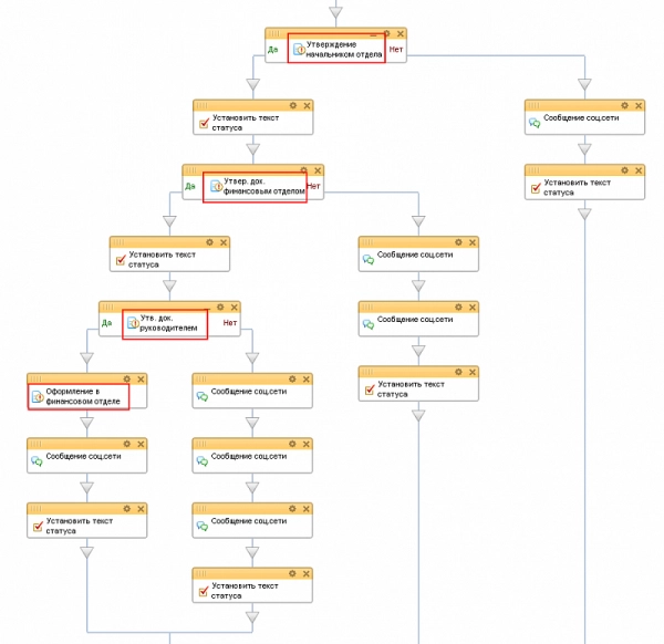 Затем идут шаги согласования в различных отделах компании. Для всех утверждений мы будем использовать действие "Утверждение документа". В итоге получаем бизнес-процесс вида: