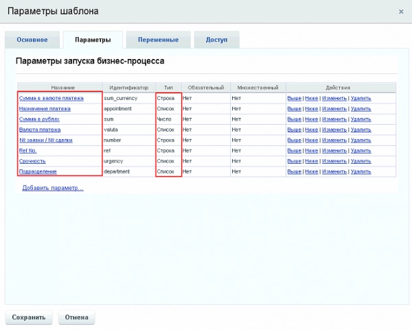 Начинаем с передачи параметров бизнес-процесса, которые пользователь будет заполнять на 1 шаге:
