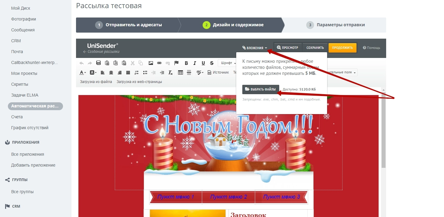 Для вложения файла в шаблон письма на рассылку, создаем новую рассылку, либо берем из черновиков уже готовую и на этапе редактирования Дизайна и содержимого, вкладываем наш файл, предварительно сохраненный на локальном компьютере.  Для этого в блочном или HTML редакторе шаблонов нажимаем на верхней панели кнопку Вложения - Выбрать файлы. Находим на компьютере необходимый файл, нажимаем на него левой кн. мыши и жмем кн. Открыть, либо делаем двойной щелчок левой кн.мыши на нужном файле. Прикрепить можно любое количество файлов, которые по суммарному объему не превышают 5 МБ. Запрещены к отправке файлы с расширениями: exe, chm, bat, cmd и им подобные.