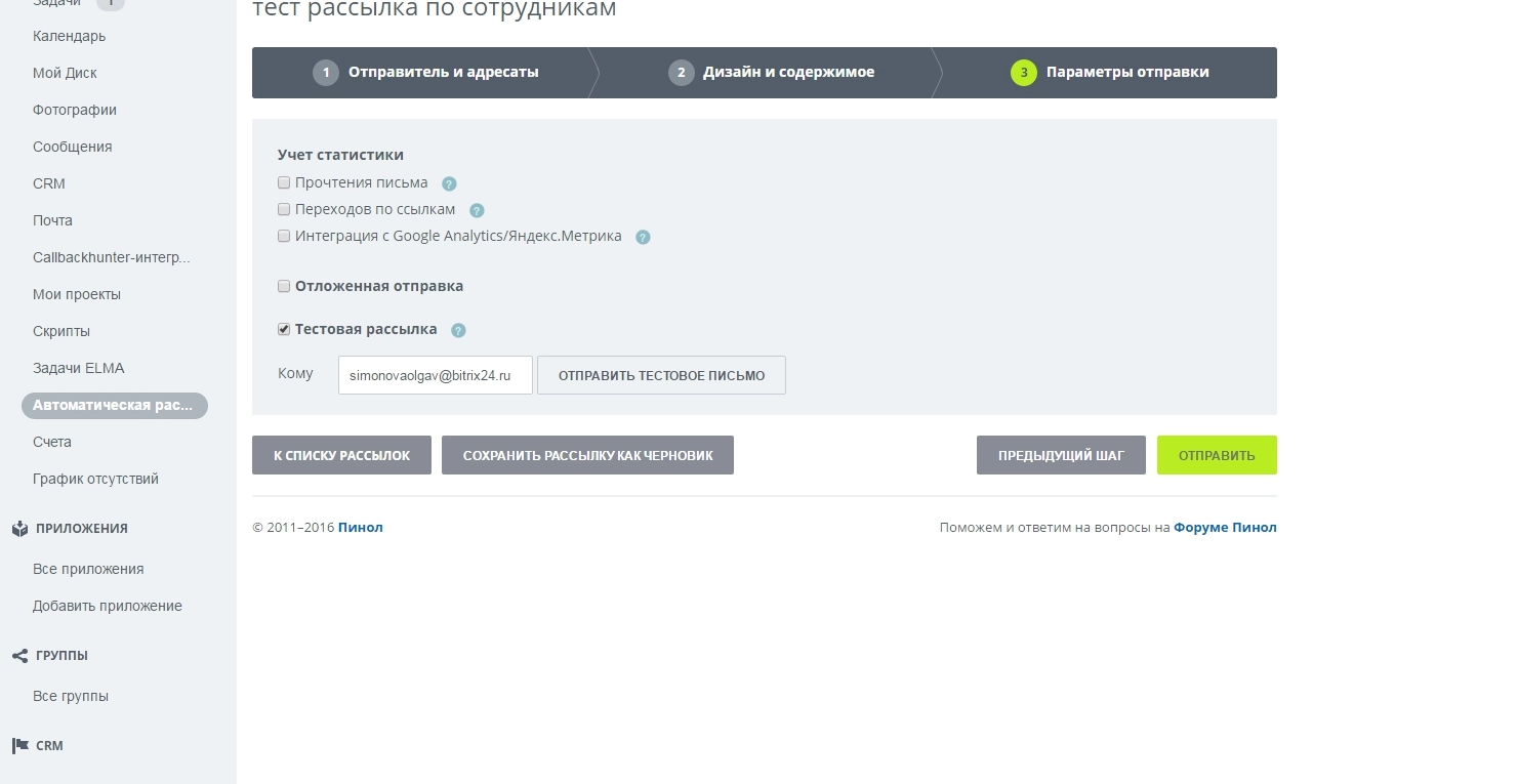 По окончании редактирования не забудьте нажать кнопку Сохранить и переходите к следующему шагу, которым является, непосредственно, отправка письма. Вы можете сделать тестовую рассылку, отложить отправку и включить учет статистики по пунктам, активируя данные поля "галочками". По окончании, нажимаем Отправить.