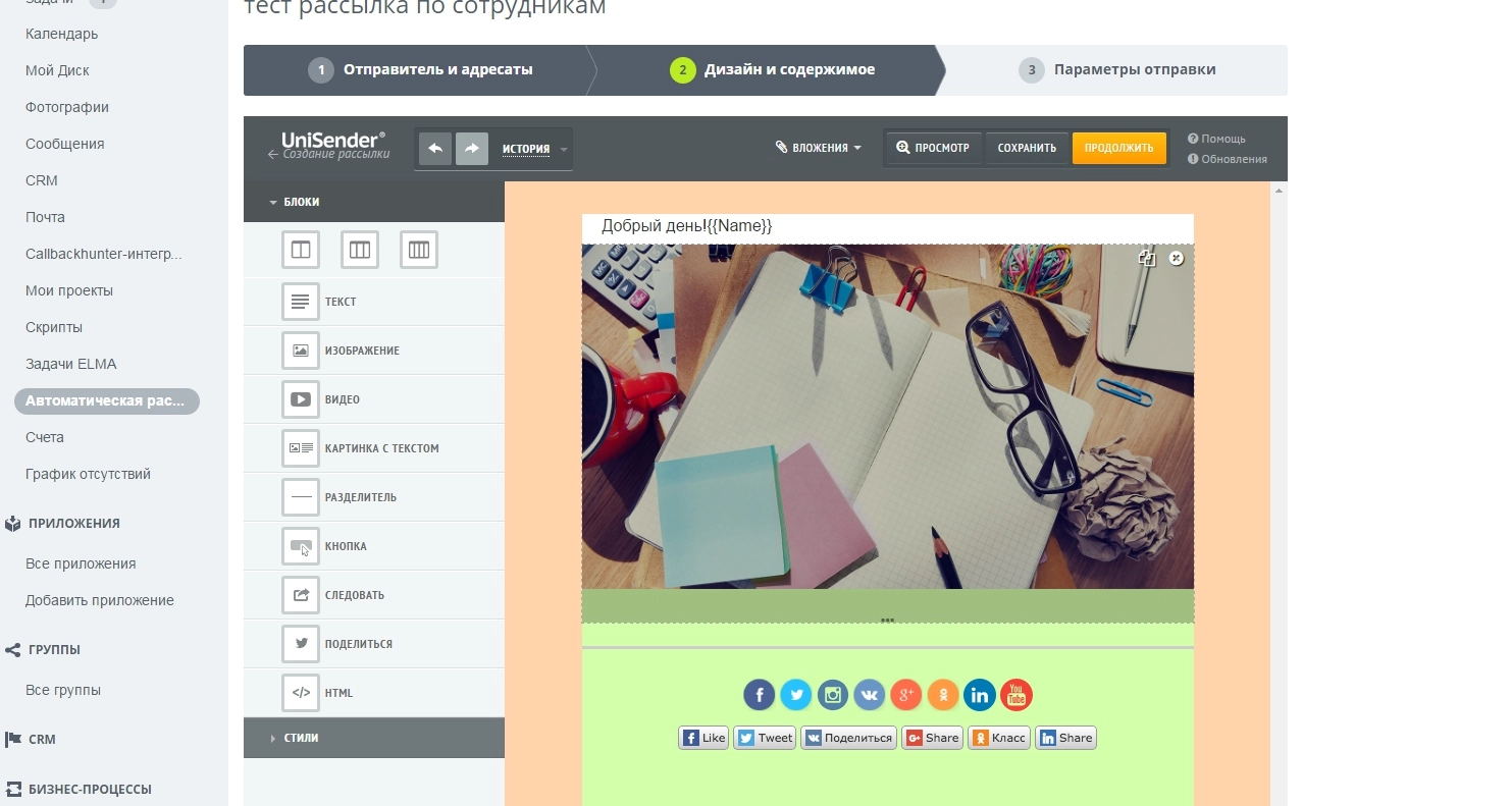 Нажимаем кнопку, находящуюся под списком, Добавить в рассылку. Переходим к выбору варианта дизайна шаблона. Далее перед нами открывается уже известный блочный редактор, где мы можем редактировать выбранный шаблон.