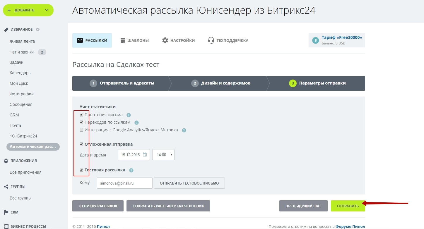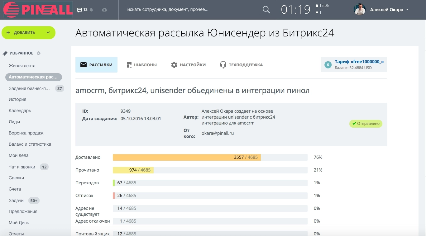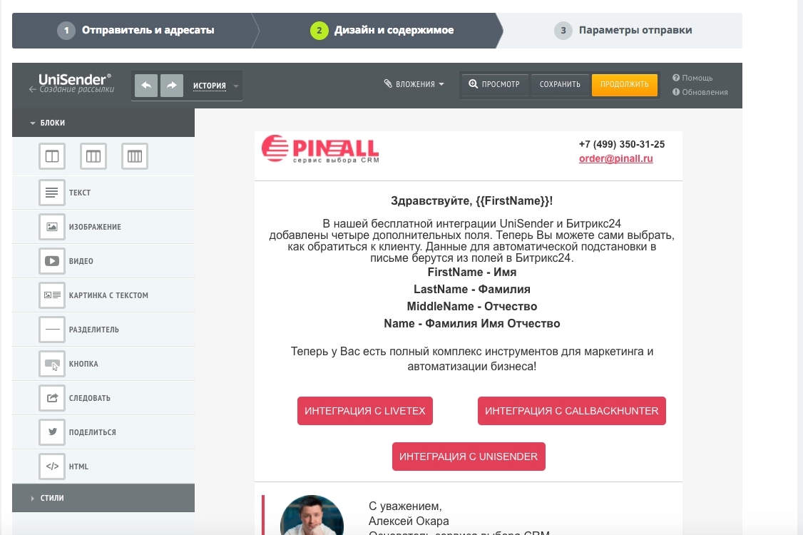 В этой статье мы продолжаем описание сценариев работы бесплатной интеграции CRM Битрикс24 и сервиса e-mail рассылок UniSender, которая разработана компанией PINALL.