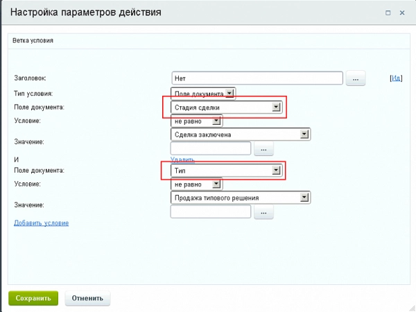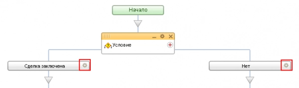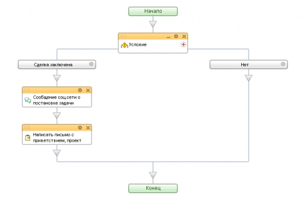 В начале задаем условие выполнения бизнес-процесса, т.е. если "Сделка заключена" и тип сделки - "Продажа типового решения", то мы создается задача. Если нет - то бизнес-процесс прекращается.