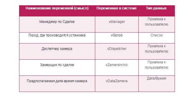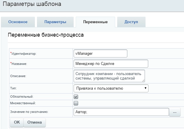 На следующем этапе надо определить переменные, а также другие настройки, применённые к имплементированному бизнес-процессу. Из настроек я выбираю переменные в таблицу (Таблица 1). Для того, чтобы беспорядочные наименования переменных более не мешали мне работать, я унифицирую их названия в используемый мной формат (v [Название_Переменной]). На изображении (Рисунок 1) показана настройка переменной для Менеджера по Сделке.