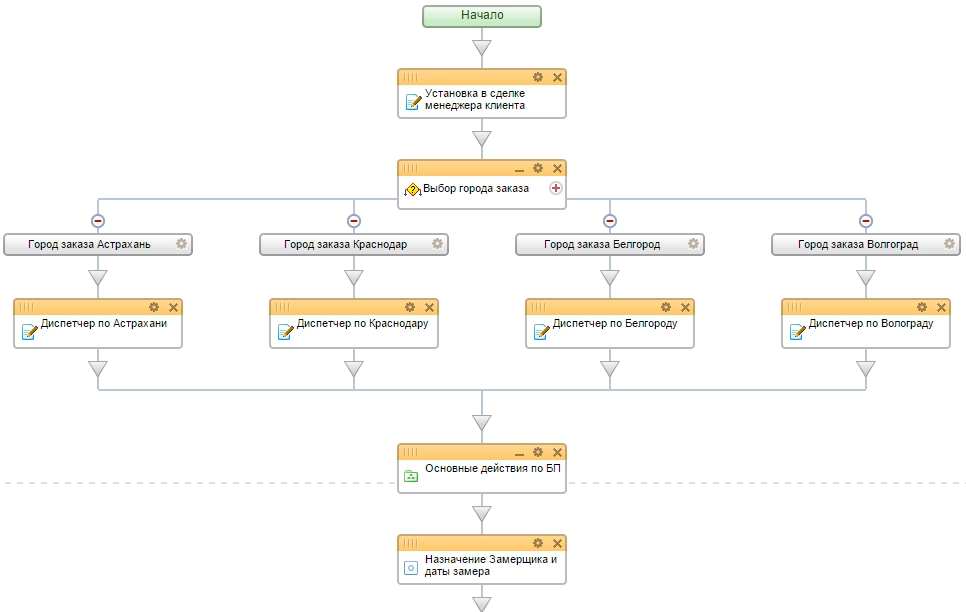 Схема бизнес-процесса в визуальном редакторе Битрикс24 (фрагмент).В данной работе выявляются бизнес-роли пользователей. В отличие от процесса, выстраиваемого мной в нотации BPMN, роли в явном виде в визуальном редакторе Битрикс24 не видны. Потребуется некоторые аналитические усилия, дабы их раскрыть. Можно прибегнуть к содействию владельцев бизнес-процесса, но, по моему опыту, лучше выстроить весь процесс самому, а уж потом общаться с бизнесом в стиле «Здесь вот так? Или нет? А как тогда? Хорошо. Сделаю так.».