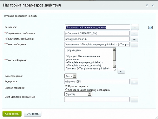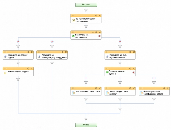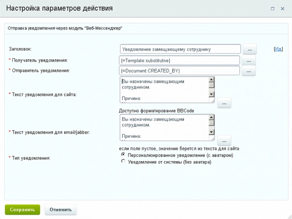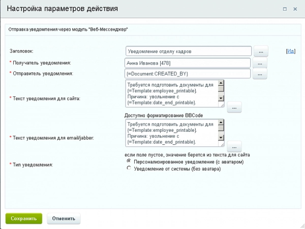 Действием "Уведомление пользователя" настраиваем рассылку сообщений в отдел кадров, системному администратору и замещающему сотруднику.