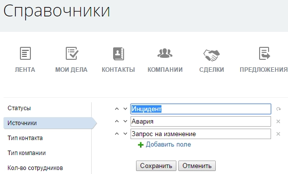 Таким образом, сущность «Лид» будет выполнять роль сущности «Обращение в службу техподдержки». В сущности «Лид» достаточно полей, которые мы можем настроить для того, чтобы он стал выполнять роль обращения. В качестве примера, изменю стандартное поле лида – «Источник» на необходимое для работы с обращением «Тип обращения».
