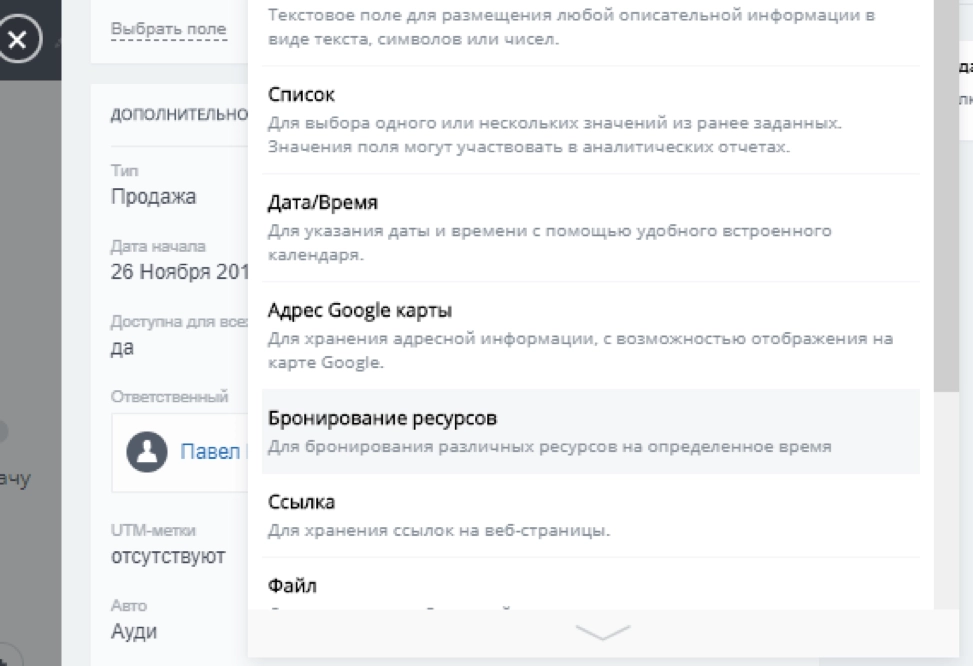 При этом в лидах запись осуществляется не из вкладки, а из добавляемого пользовательского поля «Бронирование ресурсов». Недостатком такого подхода является то, что при случайном удалении поля можно потерять всю информацию по сделанным бронированиям.